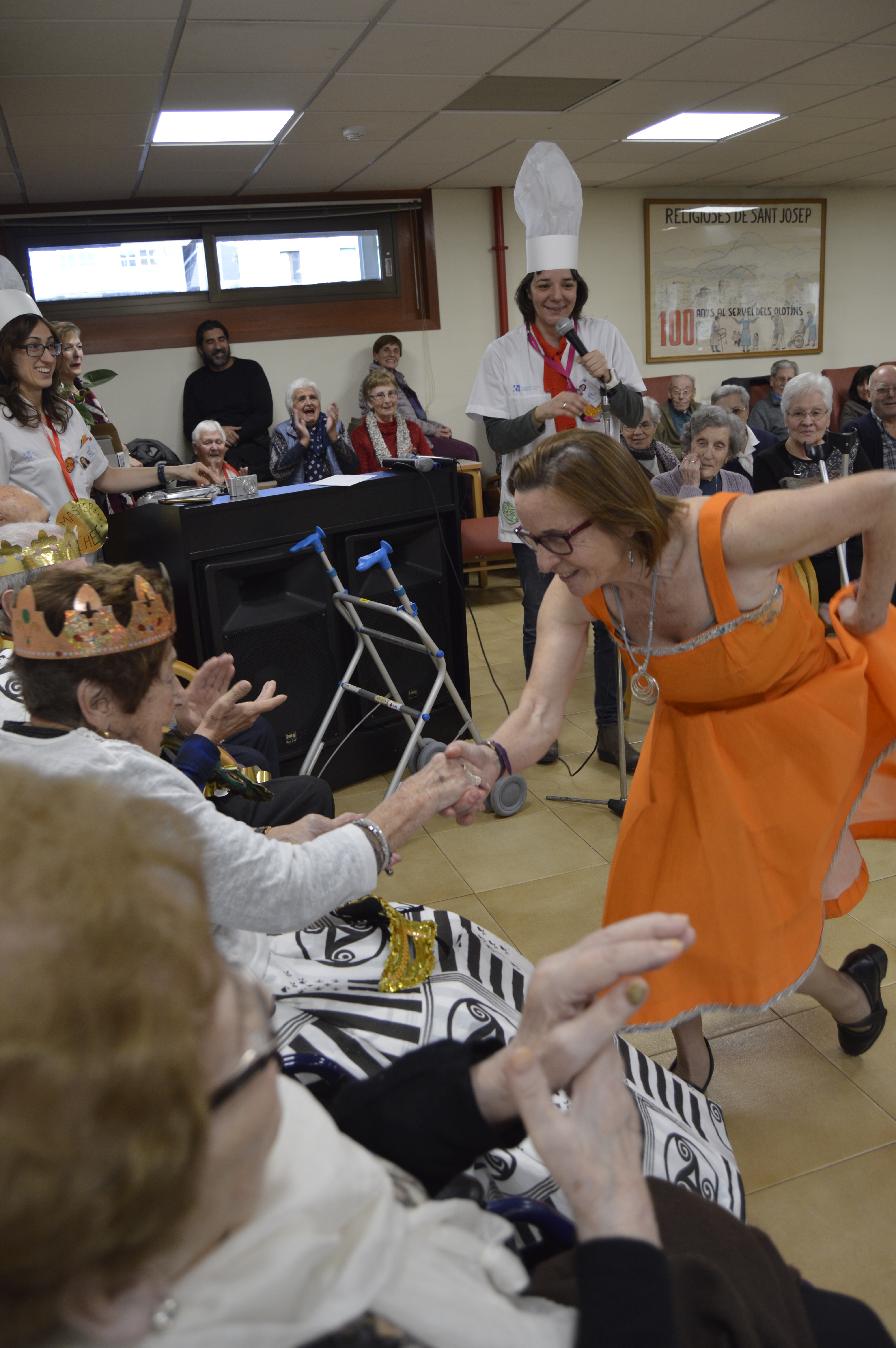 Després d’una pausa per berenar una bona xocolata desfeta amb melindros, continuà la vetllada amb un seguit d’actuacions de playback que satisferen les delícies de tots els residents. Novament les nostres voluntàries, dotades d’un gran talent per l’espectacle, deixaren tothom bocabadat amb les seves actuacions. També, vam tenir la visita dels nostres capgrossos, en Pep i la Tureta, que ens van ballar la seva folca tan especial.