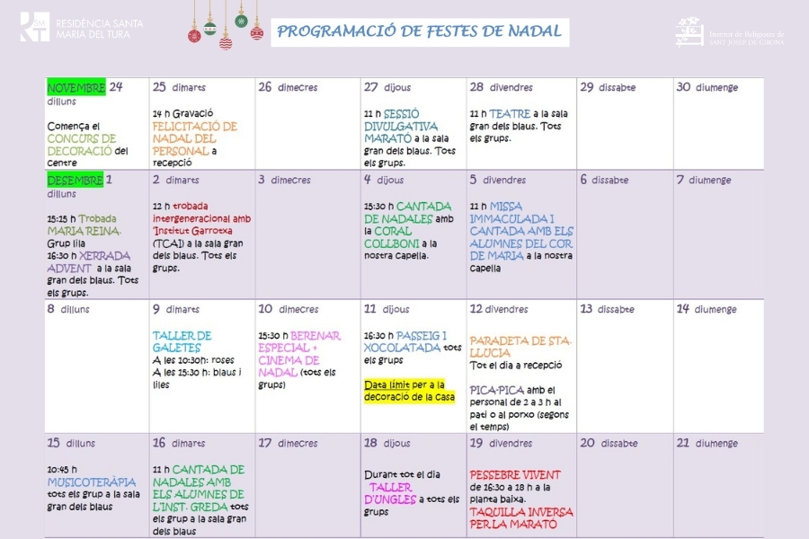 El Programa de Navidad de nuestro Centro se puso en marcha el 24 de noviembre con un concurso de decoración navideña, con la participación activa de las personas residentes. En este marco, también se grabó la tradicional felicitación de Navidad del equipo de profesionales de la Residència Santa Maria del Tura, dirigida a las personas atendidas y a sus familias.